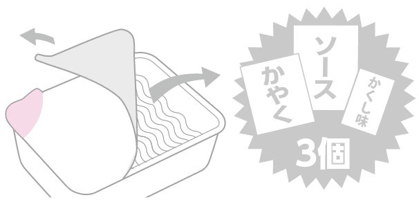 外装フィルムを剥きフタをAからBの線まではがし、ソース、かやく、かくし味を取り出します。