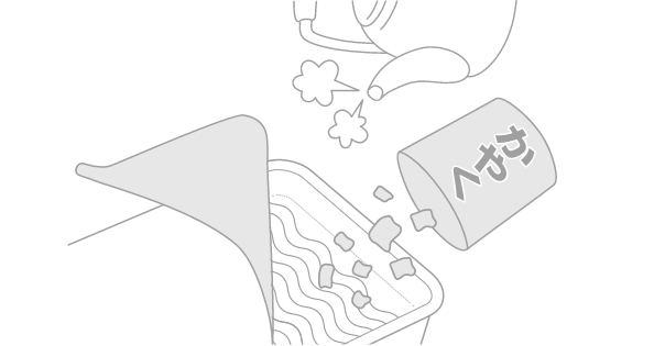 かやくをめんの上にあけ、熱湯を内側の線まで注ぎ、フタをします。